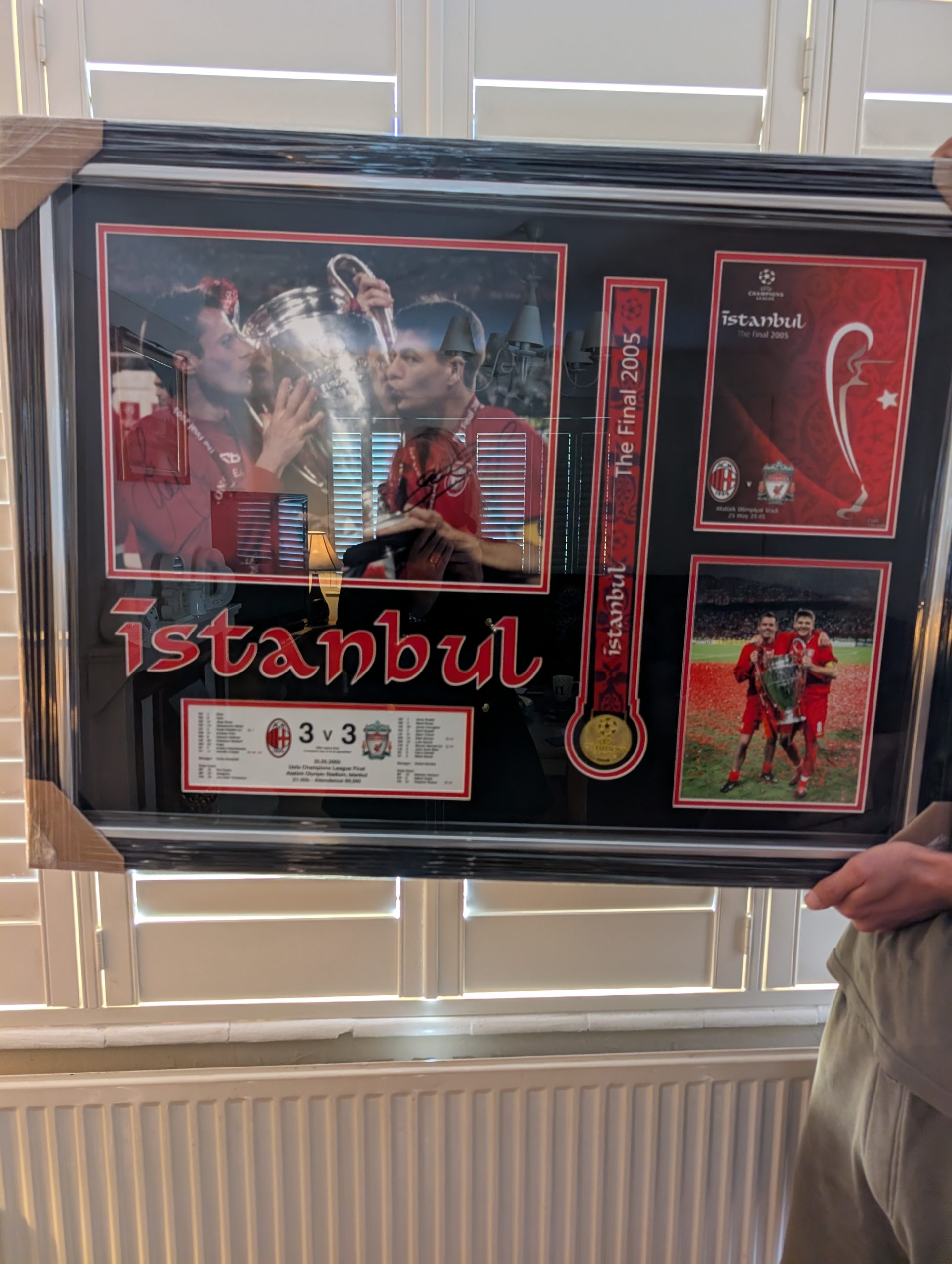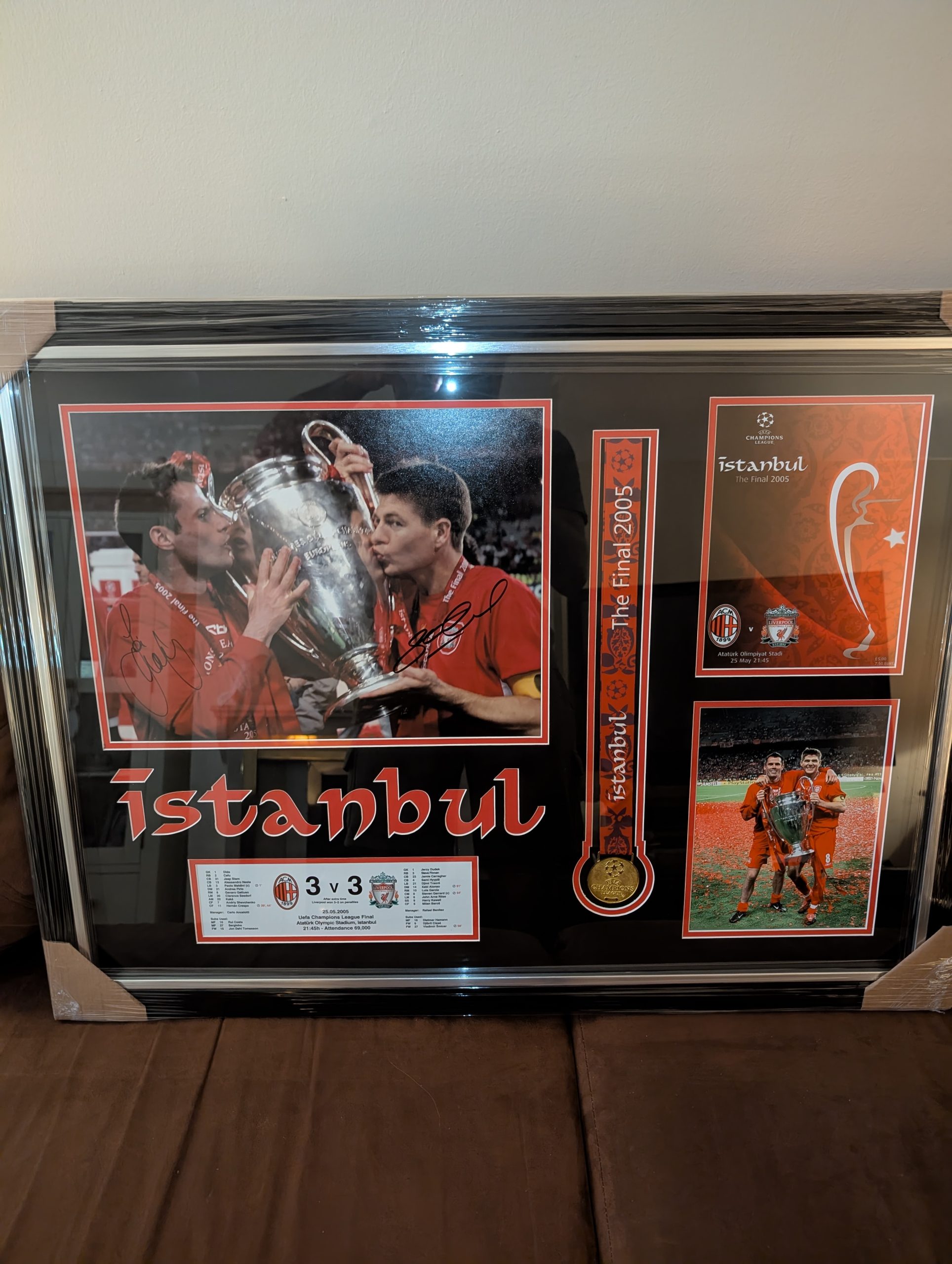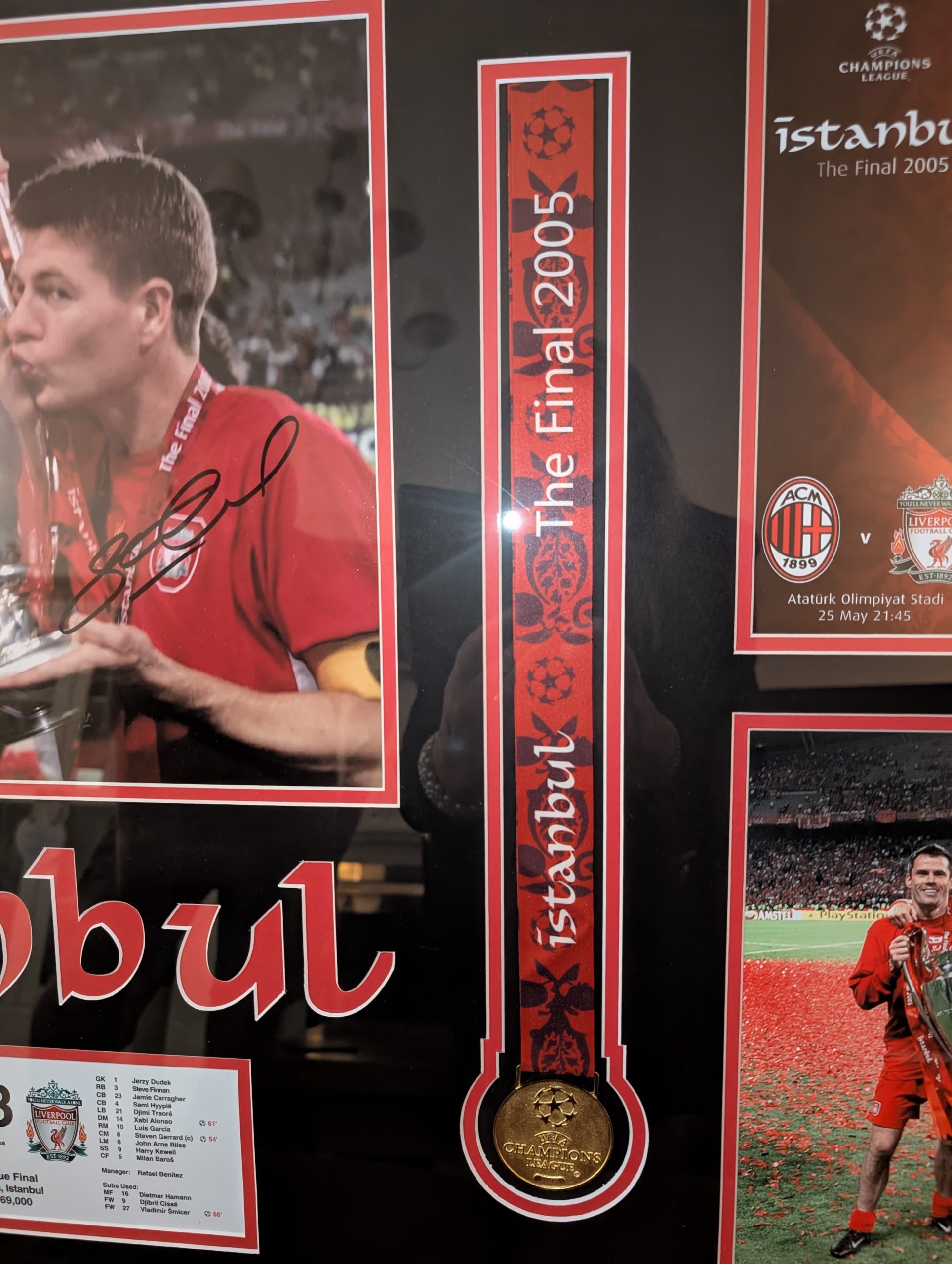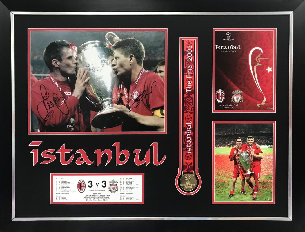 This unique framed display features a signed 2005 Istanbul Champions League Final winner’s medal, alongside images signed by Steven Gerrard and Jamie Carragher.
